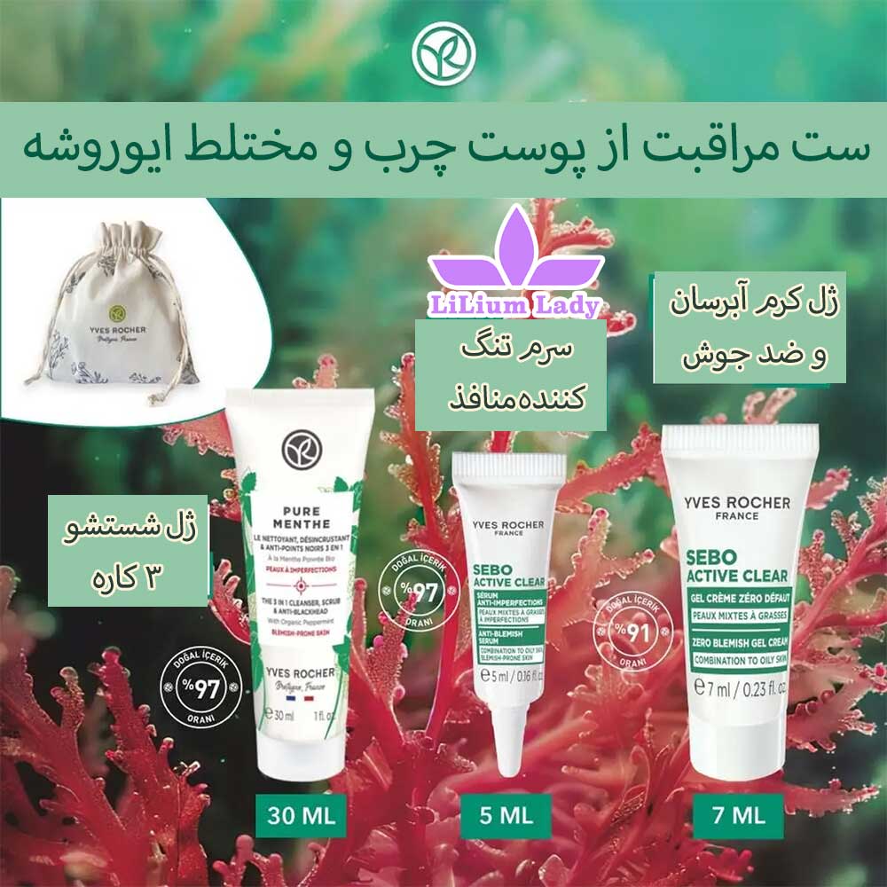 ایوروشه مجموعه ۳ تایی مراقبت از پوست مستعد آکنه را برای هدیه ای کاربردی در یک کیف پارجه ای شیک با آرم “YVES ROCHER” ارائه کرده است که شامل موارد زیر است: